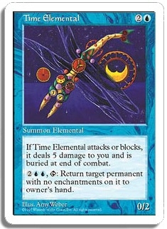 If Time Elemental attacks or blocks, it deals 5 damage to you and is buried at end of combat. <2UU,T>: Return target permanent with no enchantments on it to owner's hand.