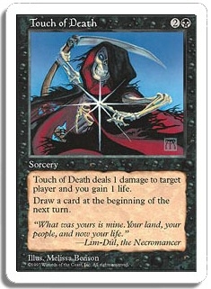 Touch of Death deals 1 damage to target player and you gain 1 life. Draw a card at the beginning of the next turn.