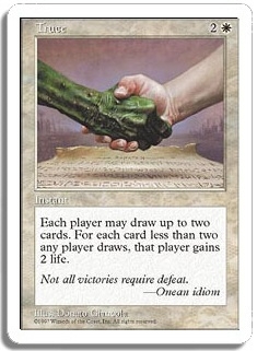 Each player may draw up to two cards. For each card less than two any player draws, that player gains 2 life.