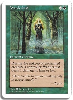During the upkeep of enchanted creature's controller, Wanderlust deals 1 damage to him or her.