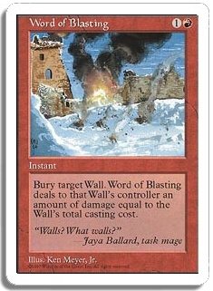 Bury target Wall. Word of Blasting deals to that Wall's controller an amount of damage equal to the Wall's total casting cost.