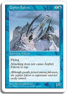 Flying. Attacking does not cause Zephyr Falcon to tap.