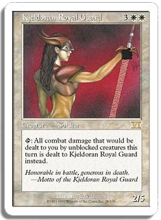 T: All combat damage that would be dealt to you by unblocked creatures this turn is dealt to Kjeldoran Royal Guard instead.
