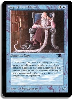 Tap to draw a card from your library. Each time you use this ability, you must choose one of your artifacts in play and place it in the graveyard. This artifact cannot be one that is already on its way to the graveyard, and artifact creatures killed this way may not be regenerated.