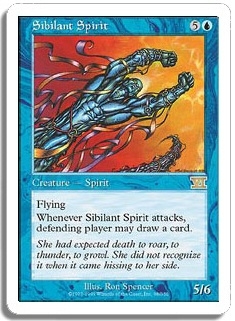 Flying Whenever Sibilant Spirit attacks, defending player may draw a card.