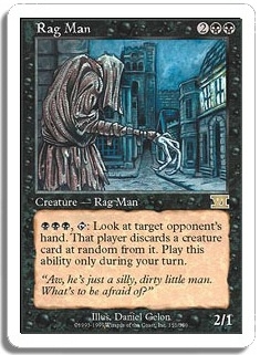 BBB, T: Look at target opponent's hand. That player discards a creature card at random from it. Play this ability only during your turn.