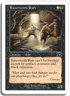Razortooth Rats can't be blocked except by artifact creatures and/or black creatures.