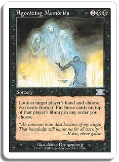 Look at target player's hand and choose two cards from it. Put those cards on top of that player's library in any order.