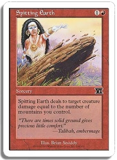 Spitting Earth deals to target creature damage equal to the number of mountains you control.