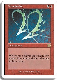 Whenever a player taps a land for mana, Manabarbs deals 1 damage to him or her.