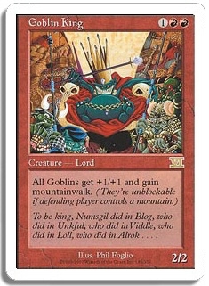 All Goblins get +1/+1 and have mountainwalk. (They're unblockable as long as defending player controls a mountain.)