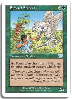 T: Femeref Archers deals 4 damage to target attacking creature with flying.