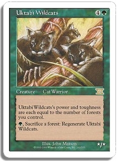 Uktabi Wildcats's power and toughness are each equal to the number of forests you control. G, Sacrifice a forest: Regenerate Uktabi Wildcats.
