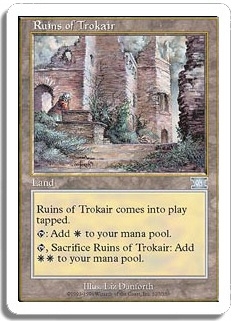 Ruins of Trokair comes into play tapped.T: Add W to your mana pool. T, Sacrifice Ruins of Trokair: Add WW to your mana pool.