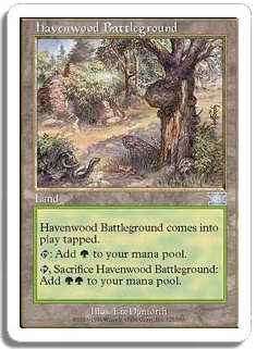 Havenwood Battleground comes into play tapped.T: Add G to your mana pool. T, Sacrifice Havenwood Battleground: Add GG to your mana pool.