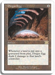Whenever a land is put into a graveyard from play, Dingus Egg deals 2 damage to that land's controller.