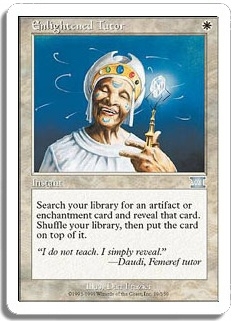 Search your library for an artifact or enchantment card and reveal that card. Shuffle your library, then put the card on top of it.