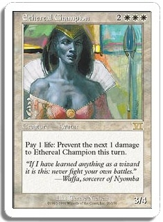 Pay 1 life: Prevent the next 1 damage that would be dealt to Ethereal Champion this turn.