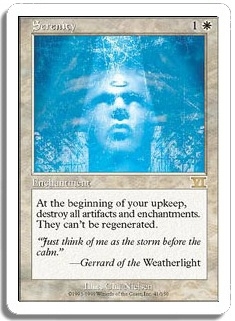 At the beginning of your upkeep, destroy all artifacts and enchantments. They can't be regenerated.