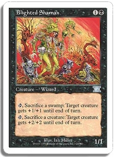 T, Sacrifice a swamp: Target creature gets +1/+1 until end of turn. T, Sacrifice a creature: Target creature gets +2/+2 until end of turn.