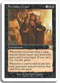 If you would draw a card, return a card from your graveyard to your hand instead. If you can't, you lose the game.If a card would be put into your graveyard, remove that card from the game instead.
