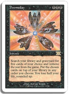 Search your library and graveyard for any five cards and remove the rest from the game. Put the chosen cards on top of your library in any order. You lose half your life, rounded up.
