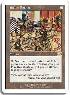 X, Sacrifice Snake Basket: Put X 1/1 green Cobra creature tokens into play. Play this ability only if you could play a sorcery.