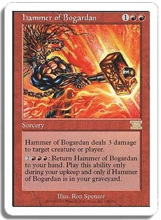 Hammer of Bogardan deals 3 damage to target creature or player.2RRR: Return Hammer of Bogardan to your hand. Play this ability only during your upkeep and only if Hammer of Bogardan is in your graveyard.
