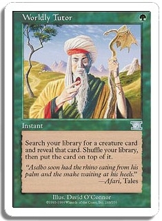Search your library for a creature card and reveal that card. Shuffle your library, then put the card on top of it.