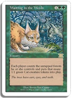 Each player puts a 1/1 green Cat creature token into play for each untapped forest he or she controls.
