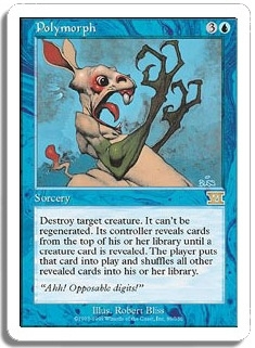 Destroy target creature. It can't be regenerated. Its controller reveals cards from the top of his or her library until a creature card is revealed. The player puts that card into play and shuffles all other cards revealed this way into his or her library.