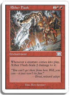 Whenever a creature comes into play, Aether Flash deals 2 damage to it.