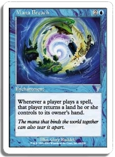 Whenever a player plays a spell, that player returns a land he or she controls to its owner's hand.