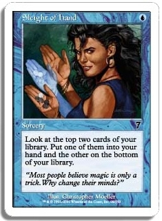 Look at the top two cards of your library. Put one of them into your hand and the other on the bottom of your library.