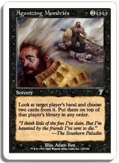 Look at target player's hand and choose two cards from it. Put them on top of that player's library in any order.