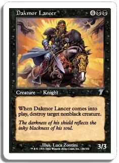 When Dakmor Lancer comes into play, destroy target nonblack creature.
