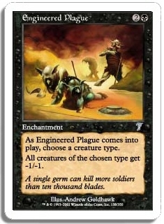 As Engineered Plague comes into play, choose a creature type. All creatures of the chosen type get -1/-1.