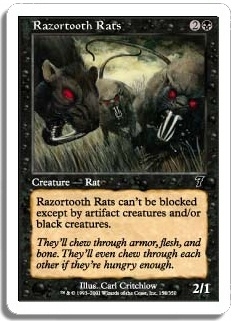 Razortooth Rats can't be blocked except by artifact creatures and/or black creatures.
