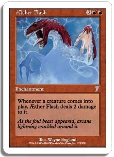 Whenever a creature comes into play, Aether Flash deals 2 damage to it.