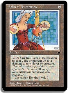 <1,T>: Sacrifice Balm of Restoration to gain 2 life or prevent up to 2 damage to any player or creature.