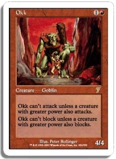 Okk can't attack unless a creature with greater power also attacks. Okk can't block unless a creature with greater power also blocks.