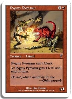 Pygmy Pyrosaur can't block. R: Pygmy Pyrosaur gets +1/+0 until end of turn.
