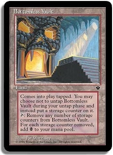 Comes into play tapped. You may choose not to untap Bottomless Vault during your untap phase and instead put a storage counter on it. <T>: Remove any number of storage counters from Bottomless Vault. For each storage counter removed, add <B> to your mana pool.