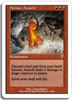 Discard a land card from your hand: Seismic Assault deals 2 damage to target creature or player.