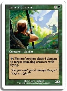 T: Femeref Archers deals 4 damage to target attacking creature with flying.