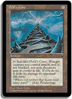 <T>: Sacrifice Delif's Cone. If target creature you control attacks and is not blocked, you may choose to gain its power in life. If you do so, it deals no damage to opponent this turn.