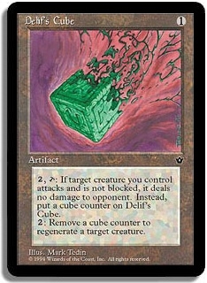 <2,T>: If target creature you control attacks and is not blocked, it deals no damage to opponent. Instead, put a cube counter on Delif's Cube. <2>: Remove a cube counter to regenerate a target creature.