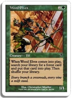 When Wood Elves comes into play, search your library for a forest card and put that card into play. Then shuffle your library.