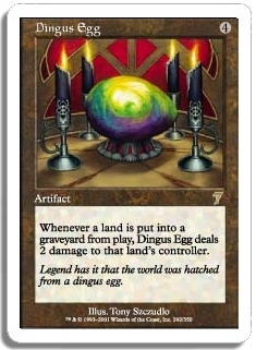 Whenever a land is put into a graveyard from play, Dingus Egg deals 2 damage to that land's controller.