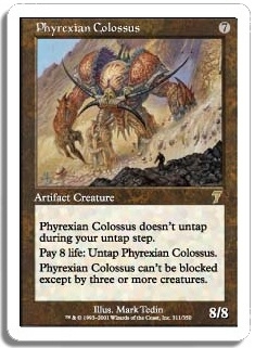 Phyrexian Colossus doesn't untap during your untap step. Pay 8 life: Untap Phyrexian Colossus. Phyrexian Colossus can't be blocked except by three or more creatures.